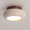 Realizzata in travertino e legno, questa plafoniera compatta emette un bagliore morbido attraverso la sua forma anulare—ideale per corridoi, armadi o camere da letto minimaliste.